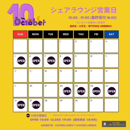 ※シェアラウンジは不定期営業となります。ご利用前に下記のカレンダーにて営業日をご確認の上ご来店下さい。